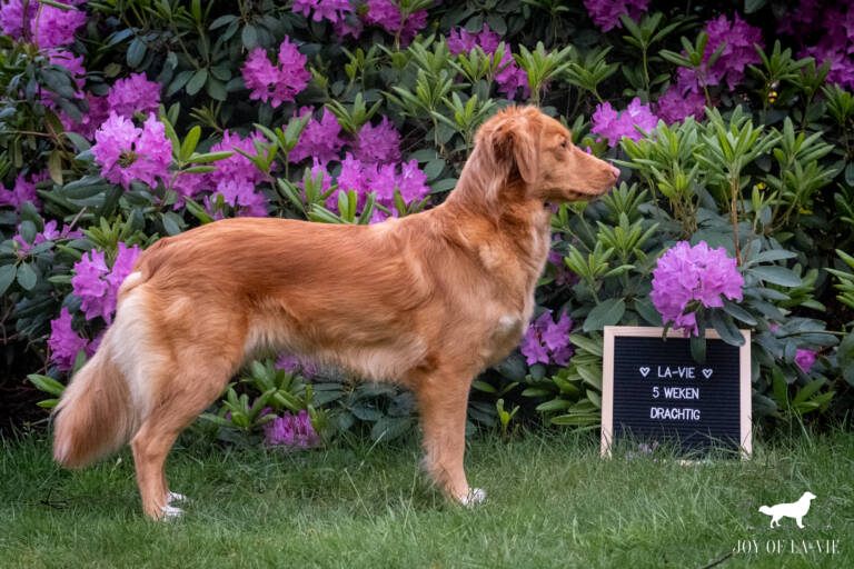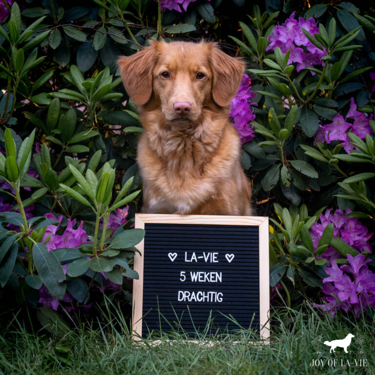Momenteel is La-Vie 5 weken drachtig. De pupjes zijn nu ongeveer zo groot als een walnoot. La-Vie haar melkklieren beginnen met ontwikkelen en ze begint al een klein buikje te krijgen. Verder is ze nog steeds erg hongerig en slaapt ze veel. Normaal is ze al een grote knuffelkont, maar nu ligt ze het liefste de hele dag bij mij op schoot.