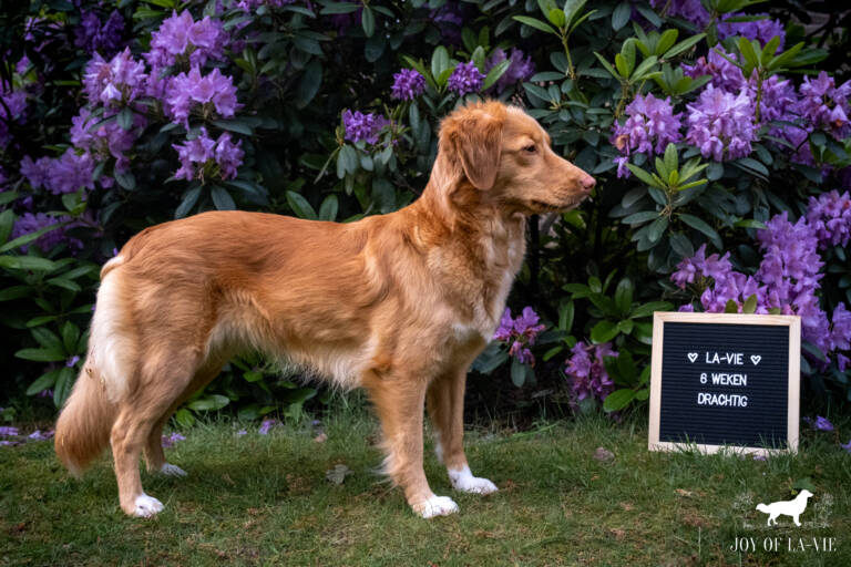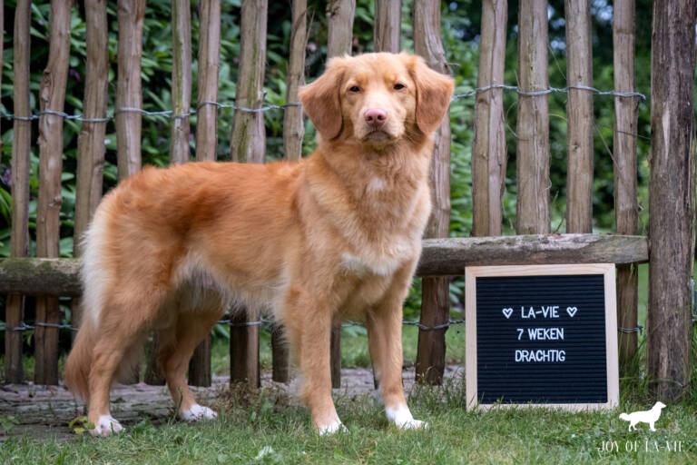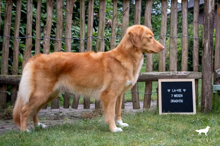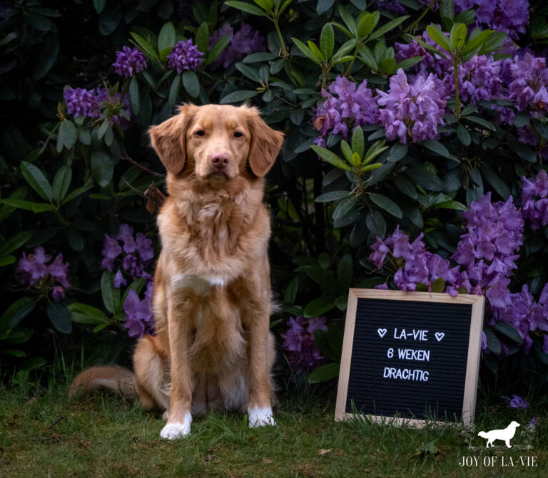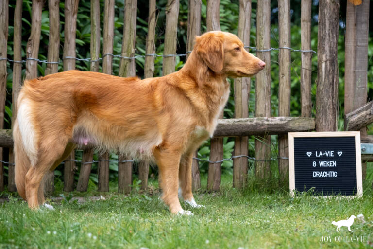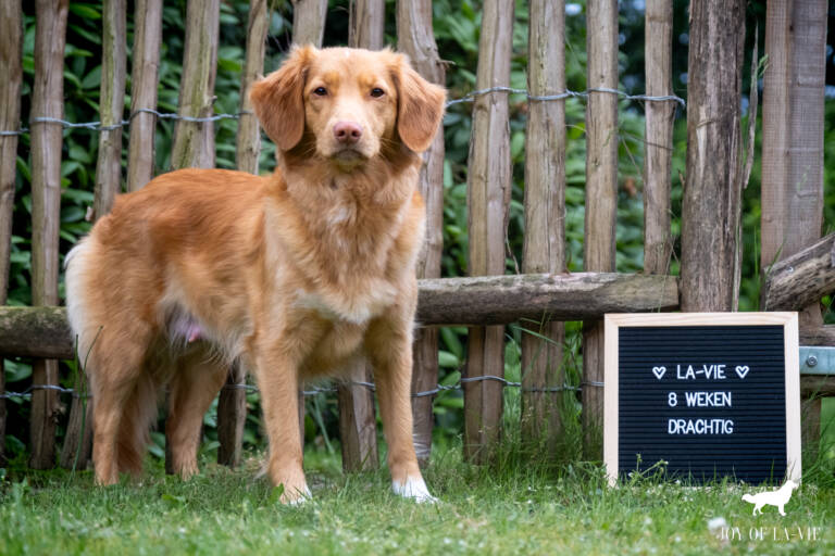 De afgelopen weken zijn gelukkig redelijk snel gegaan. Met 6 weken begon het allemaal al wel wat zwaarder te worden voor La-Vie. Ze was erg slaperig en af en toe wat misselijk. Vanaf dit moment krijgt ze 4x per dag eten en dat helpt gelukkig. Ze wandelt nog graag een stukje mee, maar een hele ronde hoeft van haar niet meer. Normaal speelt ze ook heerlijk met onze Nola, maar ook hier heeft ze minder behoefte aan. Dus we doen alles lekker rustig aan. Haar buikje begint nu wat te groeien en haar melkklieren zijn volop aan het ontwikkelen.